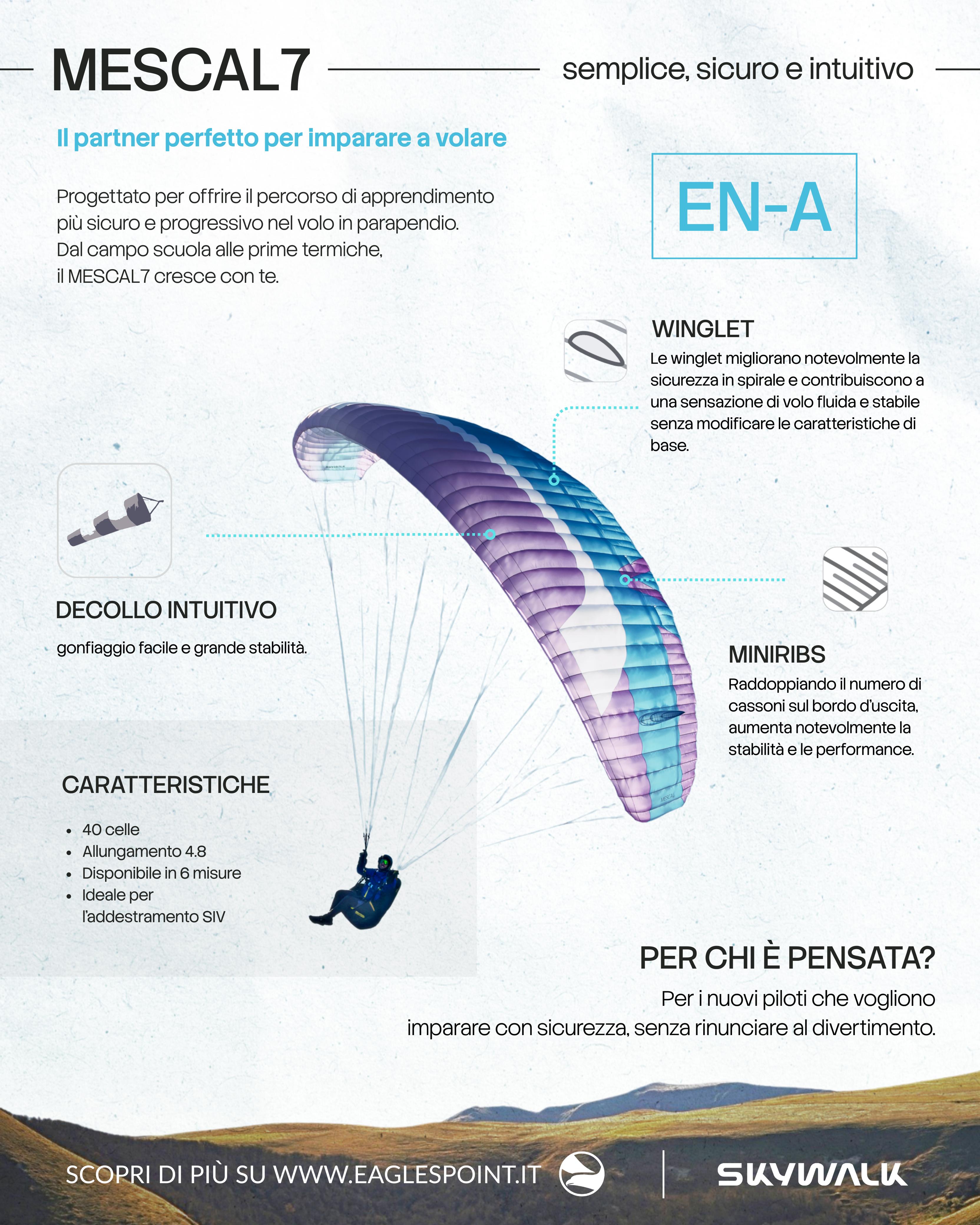Il MESCAL7 è stato progettato con un obiettivo chiaro: offrire ai nuovi piloti l'apprendimento più semplice, sicuro e intuitivo del volo in parapendio. Dai primi metri a terra ai primi voli in termica, il MESCAL7 ti accompagna lungo tutto il tuo percorso, aiutandoti ad acquisire sicurezza! Così potrai sviluppare le tue abilità di volo in modo sicuro e divertente.